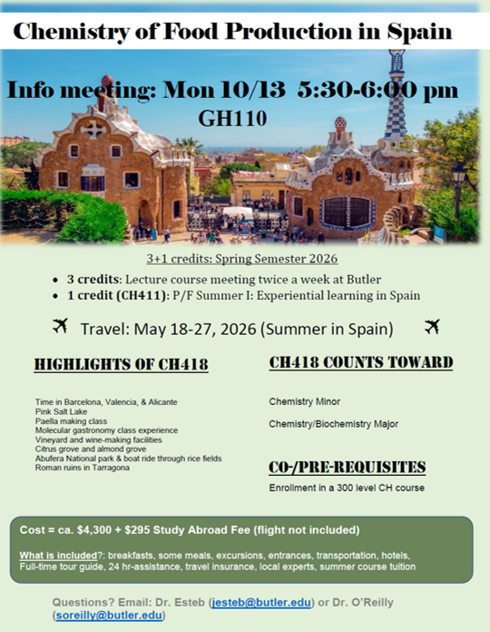 Many students pursuing STEM or health-related careers find it challenging to engage in study abroad experiences. This is due, in part, to the rigid class schedules often associated with the STEM curriculum. In 2014 the Department of Chemistry and Biochemistry recognized this challenge and responded in a unique fashion. CH418 is a Chemistry and Global issues course and is open to any student who has completed at least 4 credit hours in chemistry at the 300-level or above. The course focuses on a relevant and exciting global issue (sustainability, food, natural products, warfare, conservation) and incorporates a required short-term study abroad experience. We cover content during the semester and research, discuss, and read about the issue being studied using chemistry as a lens. When we travel, we visit sites that are specific to the theme that allow us to engage with people. Below are a list of past courses offered along with potential upcoming themes and study abroad destinations (subject to change). Where will Chemistry take you while you are at Butler?