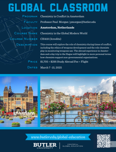 Chemistry plays a crucial role in the development and manufacture of weapons, as well as in the enforcement of treaties aimed at restricting their use. This course examines the involvement of chemistry and chemists in times of conflict and explores the motivations behind scientists’ decisions to engage in weapons research. The study-abroad experience in Amsterdam and The Hague provides historical context, particularly concerning the World War 2 era, allowing students to critically consider the ethical dilemmas faced by scientists during wartime.