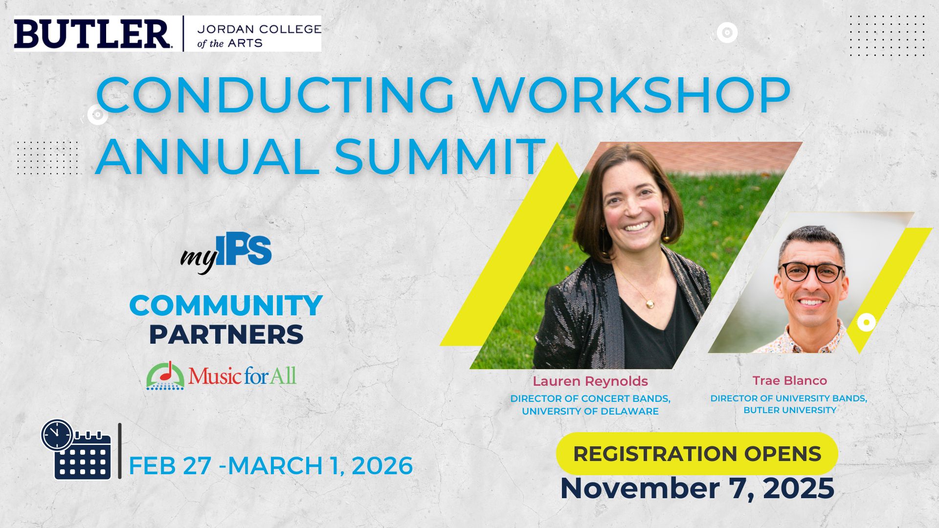 The Conducting Workshop Annual Summit will take place at the Butler University School of Music in collaboration with our community partners: Indianapolis Public Schools, Music for All, Inc., and other partners announced soon. In-Person activities will include: conducting the BU Wind Ensemble, attending masterclasses and discussions with the guest presenters, as well as building relationships within our community as we pursue our musical growth together.