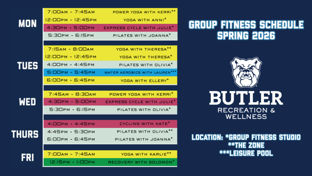 Class times will change each semester based off of the availability of our instructors and the Butler University academic calendar. To stay up-to-date on our group fitness schedule each semester, check this page or follow @BURecWell on Instagram.